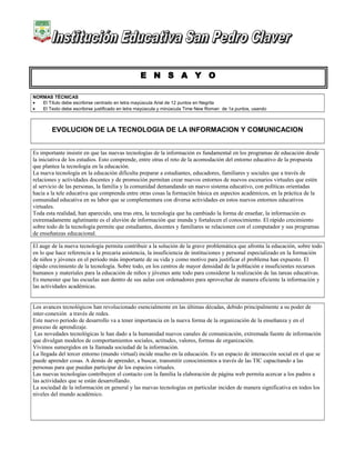 El documento describe la evolución de la tecnología de la información y la comunicación en la educación. Explica que las nuevas tecnologías son fundamentales en los programas educativos y requieren ajustes en el entorno educativo. También señala que la tecnología permite nuevos escenarios virtuales que apoyan el aprendizaje y que las escuelas deben integrar la cultura digital. Finalmente, concluye que las nuevas tecnologías influyen en el mundo académico y se requiere actualizar a estudiantes, maestros