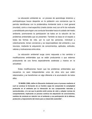 La educación ambiental busca crear conciencia sobre problemas ambientales a nivel global y local para motivar conductas de cuidado del medio ambiente. Surge en respuesta a los rápidos cambios ambientales que estamos produciendo y que hacen que los problemas sean interrelacionados. Su objetivo principal es promover el desarrollo sostenible mediante la conservación y protección del medio ambiente para mejorar la calidad de vida de las generaciones actuales y futuras.