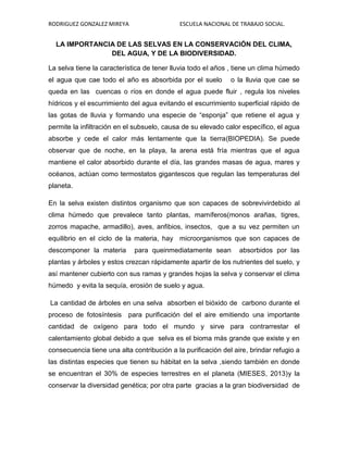 Las selvas juegan un papel fundamental en la conservación del clima, el agua y la biodiversidad de tres maneras: 1) regulan los niveles de agua y evitan inundaciones rápidas al absorber y retener el agua de lluvia como una "esponja", 2) contienen una gran diversidad de plantas y animales que interactúan en ciclos ecológicos que purifican el aire y el suelo, y 3) las plantas de la selva absorben grandes cantidades de dióxido de carbono para contrarrestar el calentamiento