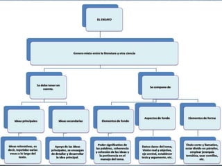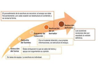 Este documento presenta información sobre la redacción de ensayos. Explica que el ensayo es un escrito breve en el que el autor expresa su punto de vista personal sobre un tema sin necesidad de mostrar un marco teórico extenso. Además, describe la secuencia metodológica para redactar un ensayo, incluyendo la selección del tema, consulta de fuentes, elaboración de un esquema y borrador, y la redacción final. También define diferentes tipos de ensayos como el ensayo literario y el ensayo