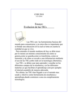Este documento discute la evolución y la importancia de las Tecnologías de la Información y la Comunicación (TICs) en la educación. Explica que las TICs son herramientas fundamentales para comunicarse en el mundo moderno y que la educación debe tomar en cuenta esta realidad. También describe cómo las TICs pueden usarse para aprender y enseñar en diferentes campos a través de Internet y otras herramientas, y cómo se han convertido en el método más utilizado y efectivo para la enseñanza y el aprendizaje.
