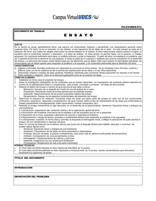Este documento define el ensayo como un escrito breve que presenta una interpretación personal sobre un tema de manera profunda y sensible. Explica que un ensayo debe plantear y resolver un problema o pregunta a través de una investigación e ideas propias y ajenas. Además, detalla las características, pasos y normas para elaborar un ensayo de manera estructurada y con estilo cuidadoso.