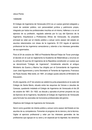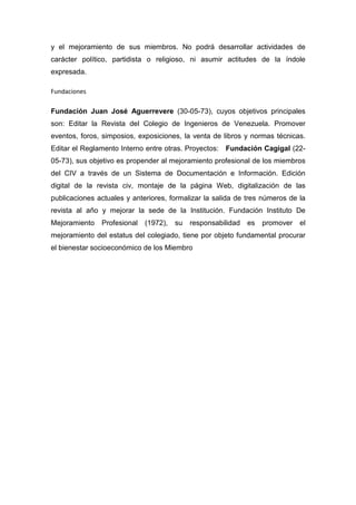 El Colegio de Ingenieros de Venezuela (CIV) es un organismo público que regula el ejercicio de la ingeniería en Venezuela y vela por los intereses de los ingenieros venezolanos. Fue establecido en 1861 y desde entonces ha trabajado para promover el progreso científico y técnico, asesorar al estado en asuntos de ingeniería, y proteger los derechos e intereses de los ingenieros. El CIV también supervisa varias fundaciones dedicadas a apoyar el desarrollo profesional continuo de los ingenieros