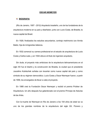 Este documento presenta biografías y obras de tres importantes arquitectos modernos: Oscar Niemeyer, Renzo Piano y Richard Rogers. Niemeyer fue pionero de la arquitectura moderna en Brasil y diseñó la nueva capital Brasilia. Piano creó obras innovadoras como el Centro Pompidou en París y el Aeropuerto Internacional de Kansai en Japón. Rogers también colaboró en el Centro Pompidou y diseñó otros edificios emblemáticos como la sede de Lloyd's de Londres.