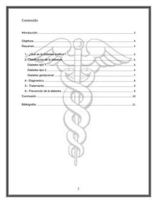 La diabetes es una enfermedad crónica caracterizada por altos niveles de glucosa en la sangre y daño vascular. Existen tres tipos principales: diabetes tipo 1 causada por la destrucción de células productoras de insulina; diabetes tipo 2 causada por resistencia a la insulina; y diabetes gestacional durante el embarazo. Su diagnóstico se basa en exámenes de glucosa en sangre y su tratamiento incluye cambios en el estilo de vida y suministro de insulina. La prevención requiere identificar factores de riesgo