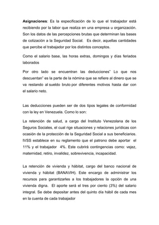 El documento habla sobre el cálculo de las asignaciones en una nómina. Explica que las asignaciones son las percepciones brutas que recibe el trabajador por conceptos como el salario base, horas extras y días festivos trabajados. También cubre las deducciones legales como los aportes al IVSS para la seguridad social y al BANAVIH para la vivienda, así como las deducciones administrativas como préstamos o anticipos acordados entre el empleado y el empleador.