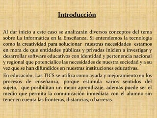 El documento analiza la importancia de la informática en la enseñanza, enfatizando la necesidad de desarrollar software educativo con identidad nacional y regional. Destaca cómo las TIC mejoran los procesos de enseñanza, fomentando un aprendizaje más rico y colaborativo. Se concluye que los docentes deben adquirir competencias informáticas para adaptarse a un sistema educacional que integra la tecnología en el aprendizaje.