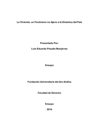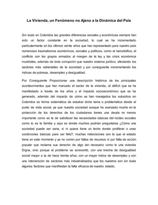 Este documento resume la historia de la vivienda en Colombia y los desafíos actuales. Explica que desde 1918 el gobierno ha tratado de satisfacer las necesidades de vivienda, pero que los problemas se han acrecentado debido al desempleo, la desigualdad y la intervención de los bancos. A pesar de los esfuerzos del gobierno, la oferta de vivienda social sigue siendo escasa y muchas personas pierden sus casas por no poder pagar los préstamos. El documento concluye que se necesitan nuevas estrategias para garantizar