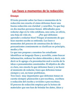 El documento describe las fases del proceso de redacción, incluyendo la planeación, escritura y revisión. Explica que la planeación implica leer materiales para obtener ideas y datos, y plantearse preguntas sobre el tema. La escritura consiste en plasmar las ideas propias y de otros autores. Finalmente, la revisión sirve para mejorar el texto y asegurar su claridad y comprensibilidad. El objetivo es enseñar a redactar de manera ordenada y efectiva.