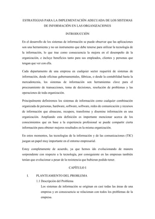 El documento aborda estrategias para la adecuada implementación de sistemas de información en las organizaciones, destacando su papel esencial en la mejora del desempeño organizacional y la toma de decisiones. Se identifican problemas comunes, como la falta de capacitación y la inadecuada circulación de información, y se proponen soluciones basadas en un sistema de información bien estructurado y seguro. La conclusión resalta que un sistema de información eficaz es clave para satisfacer las necesidades de los clientes y generar ventajas competitivas.