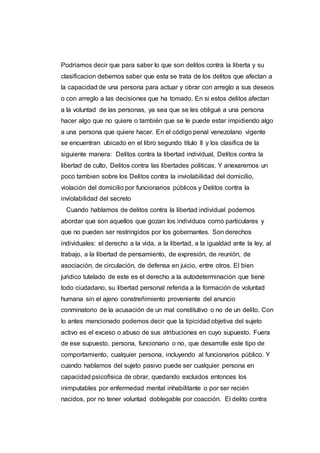 Este documento resume los delitos contra la libertad y su clasificación en el código penal venezolano. Explica que estos delitos afectan la voluntad y capacidad de las personas para actuar según sus deseos. Los clasifica en delitos contra la libertad individual, libertad de culto y libertades políticas. También cubre los delitos contra la inviolabilidad del domicilio, la violación del domicilio por funcionarios públicos, y los delitos contra la inviolabilidad del secreto.