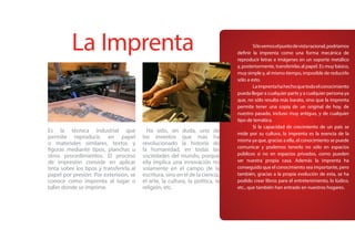 El documento describe brevemente la evolución de la imprenta desde su origen en China en el siglo VI d.C. hasta los avances técnicos del siglo XIX como la litografía y la impresión offset. Explica que Johannes Gutenberg perfeccionó la técnica de impresión con tipos móviles de metal en Europa en el siglo XV, revolucionando la producción de libros.