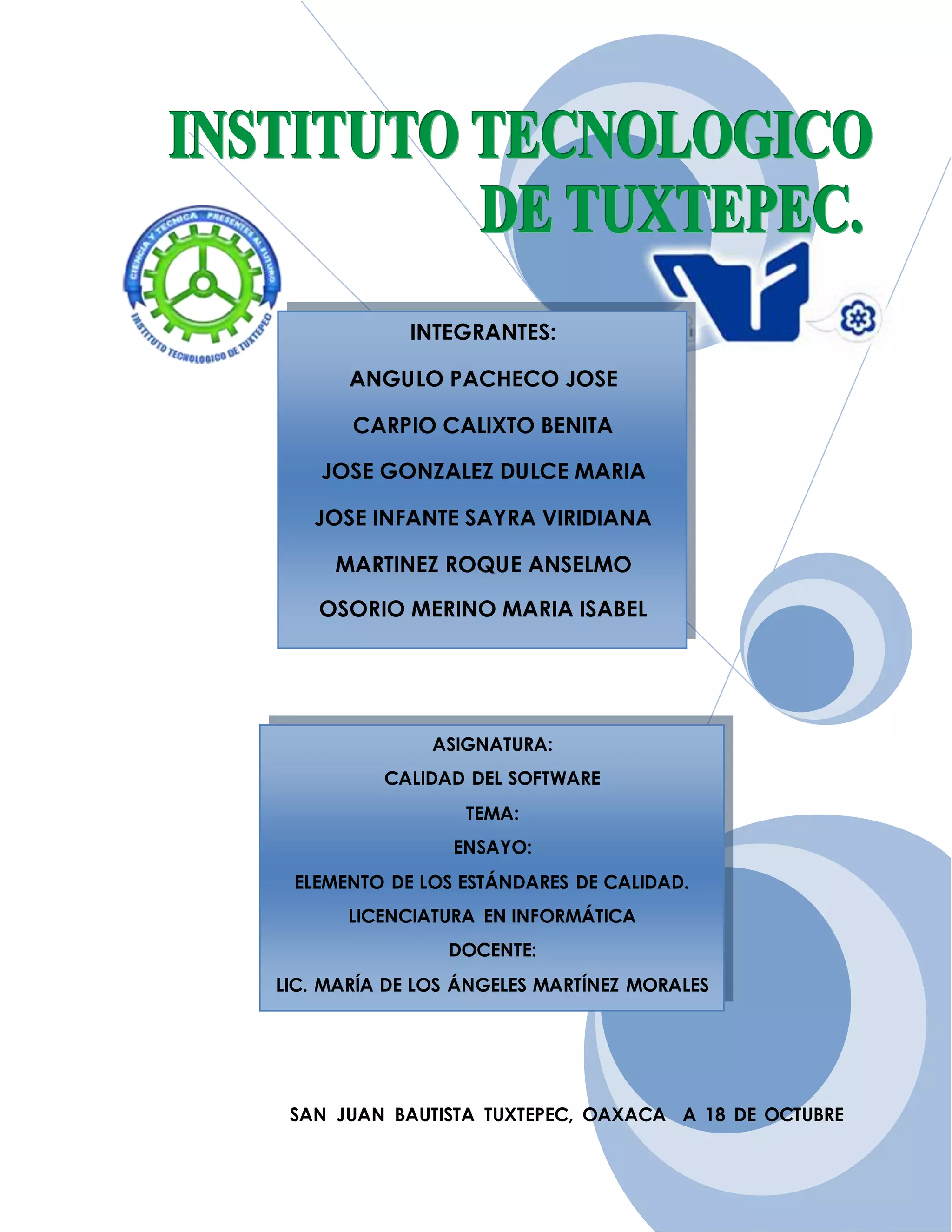 Este documento habla sobre tres estándares de calidad de software: ISO, CMM e SPICE. ISO se enfoca en verificar la calidad del diseño, desarrollo y mantenimiento de productos de software. CMM evalúa la madurez de los procesos de desarrollo de software a través de niveles. Finalmente, SPICE especifica los requisitos para un sistema de gestión de calidad de software.