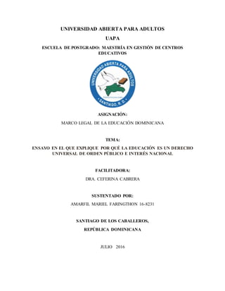 El ensayo argumenta que la educación es un derecho universal, obligatorio y gratuito en la República Dominicana, resaltando su papel crucial en el desarrollo personal y social. Se menciona que el Estado y organizaciones internacionales garantizan este derecho sin discriminación, apoyándose en leyes y tratados internacionales. La educación no solo promueve el conocimiento, sino que también fomenta una ciudadanía activa, democrática y valiosa.