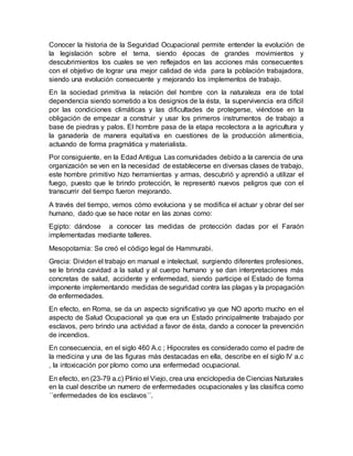 Este documento resume la historia de la salud ocupacional a través de los tiempos. Explica que en las sociedades primitivas, el hombre dependía totalmente de la naturaleza y usaba herramientas básicas de piedra y madera. Luego, en la antigüedad, las comunidades establecieron diferentes tipos de trabajos. A través de los siglos, en lugares como Egipto, Mesopotamia y Grecia se implementaron algunas de las primeras medidas de protección laboral. Finalmente, la revolución industrial causó un