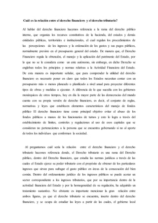 El derecho financiero regula la obtención, manejo y aplicación de los recursos del Estado, mientras que el derecho tributario estudia las normas a través de las cuales el Estado obtiene ingresos de los ciudadanos para financiar el gasto público. El derecho tributario se encuentra dentro del derecho financiero. Ambos son necesarios para que los Estados puedan contar con fondos y realizar obras a través de un presupuesto planificado.