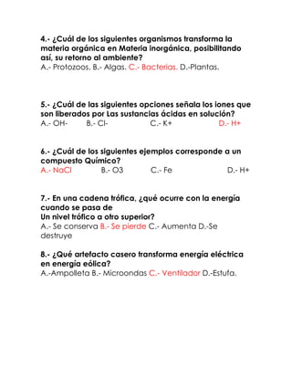 Este documento contiene 26 preguntas de opción múltiple sobre diversos temas de ciencias como química, biología y física. Las preguntas abarcan conceptos como reacciones químicas, movimiento, electricidad estática, cadenas tróficas, desarrollo embrionario humano, evolución, fuerzas y más.