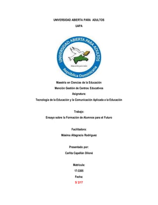 La estudiante Carlita Capellán Diloné presentó un ensayo para su asignatura Tecnología de la Educación y la Comunicación Aplicada a la Educación en la Maestría en Ciencias de la Educación con mención en Gestión de Centros Educativos de la Universidad Abierta para Adultos. El ensayo trató sobre la formación de alumnos para el futuro y fue entregado a su facilitadora Máxima Altagracia Rodríguez el 5 de febrero de 2017.