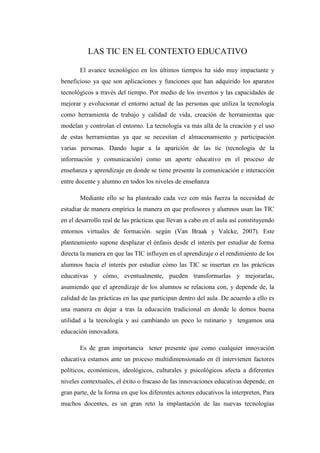 Las TIC (tecnologías de la información y comunicación) han traído cambios importantes a la educación, permitiendo nuevas formas de enseñanza y aprendizaje que van más allá del aula tradicional. El documento discute cómo las TIC pueden transformar las prácticas educativas para mejorar el aprendizaje de los estudiantes y hacer la educación más innovadora. También enfatiza la importancia de que los docentes se capaciten en el uso pedagógico de las TIC para aprovechar todo su potencial en la era del conocimiento.