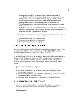 Este documento ofrece una guía para escribir ensayos académicos. Explica que un ensayo analiza brevemente un tema de manera formal. Describe las tres partes principales de un ensayo: la introducción, el cuerpo y la conclusión. La introducción presenta el propósito, enfoque y organización. El cuerpo desarrolla los puntos clave con evidencia. La conclusión resume los puntos principales. Además, ofrece consejos sobre la revisión, el estilo y el uso de la lógica y transiciones para mejor