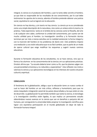 El documento discute el papel de la educación superior en un contexto de globalización y tecnología. Argumenta que la educación debe formar personas críticas y reflexivas para reducir las desigualdades entre países desarrollados y en desarrollo. También debe integrar las ciencias, la tecnología y las humanidades para abordar los retos de un mundo globalizado de manera justa y equitativa. Además, las universidades deben fomentar la investigación científica para lograr una participación equitativa en la economía global, sin descuidar