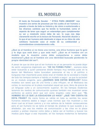 Este documento discute cómo los seres humanos tienden a seguir modelos o estereotipos para definir su identidad y comportamiento. A través de la historia, la gente ha buscado parecerse a figuras de autoridad como reyes o líderes políticos y, en la actualidad, a personas perfectas mostradas en los medios de comunicación. Siguiendo estos modelos, las personas pierden su identidad pura y se vuelven esclavas de intereses por alcanzar una identidad aparente definida por la sociedad de consumo.