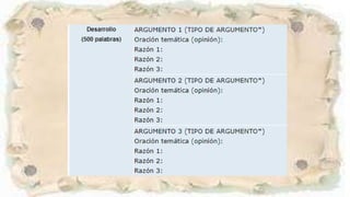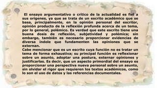 Este documento presenta los pasos para redactar un ensayo argumentativo. Explica que el ensayo debe basarse en la opinión personal del autor sustentada con evidencia. Luego, detalla los pasos a seguir: 1) seleccionar y delimitar el tema, 2) investigar sobre el tema desde diversas fuentes, 3) analizar los argumentos de otros autores, 4) buscar una idea original, 5) elaborar la tesis, 6) crear un bosquejo con la estructura, 7) desarrollar el ensayo en párrafos con un en