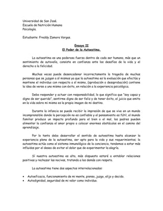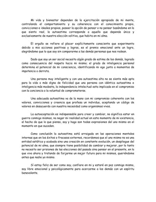 Este documento discute el concepto de autoestima y su importancia. Explica que la autoestima se refiere a la evaluación que una persona hace de sí misma, incluyendo sentimientos de autoaprobación, confianza y valor. También analiza cómo la autoestima se desarrolla durante la infancia y cómo afecta las relaciones y el éxito de una persona. Concluye resaltando que una alta autoestima depende de las operaciones mentales internas más que de logros externos.