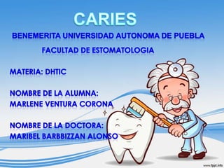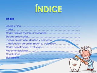 La caries dental es una enfermedad infecto-contagiosa de origen multifactorial causada principalmente por la bacteria Streptococcus mutans. Cuando el proceso de caries avanza desde el esmalte y llega hasta la dentina, generalmente comienza a presentar manifestaciones dolorosas, y si no se detiene a tiempo, puede evolucionar hasta alcanzar la pulpa dental. La mejor forma de prevenir la caries es a través de una buena higiene dental como lavarse los dientes tres veces al día, no consumir muchos dulces, y acudir al dent