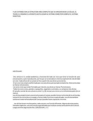 Este documento resume los conceptos básicos de célula, tejido, órgano, aparato y sistema. Explica que la célula es la unidad básica de vida y existen dos tipos principales: las eucariotas y las procariotas. También describe las características generales de las células, incluyendo sus partes y funciones. Finalmente, ofrece detalles sobre la estructura y componentes específicos de las células eucariotas y procariotas.