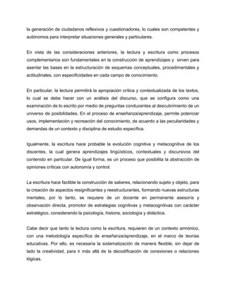 Este documento discute la importancia de la lectura y escritura académica en la sociedad del conocimiento. Señala que estos procesos son fundamentales para construir conocimientos útiles profesionalmente y formar sujetos capaces de enfrentar los desafíos de su entorno. Asimismo, destaca que la acción docente debe buscar mejorar el proceso educativo a través de innovaciones pedagógicas que despierten la curiosidad de los estudiantes. Finalmente, enfatiza que tanto la lectura como la escritura requieren de un contexto y metod