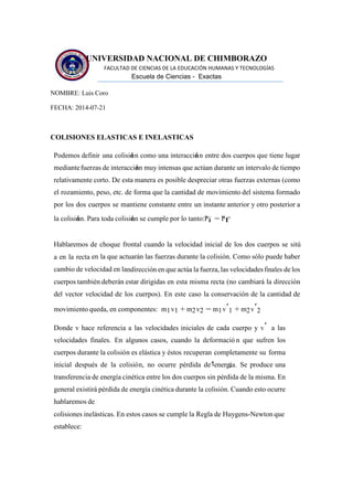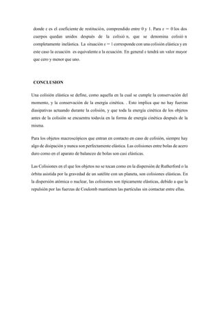Este documento describe diferentes tipos de colisiones. Explica que una colisión elástica conserva la cantidad de movimiento y la energía cinética, mientras que una colisión inelástica no conserva la energía cinética debido a la pérdida de energía. También define una colisión frontal y explica cómo se aplica la conservación de la cantidad de movimiento a este tipo de colisión.