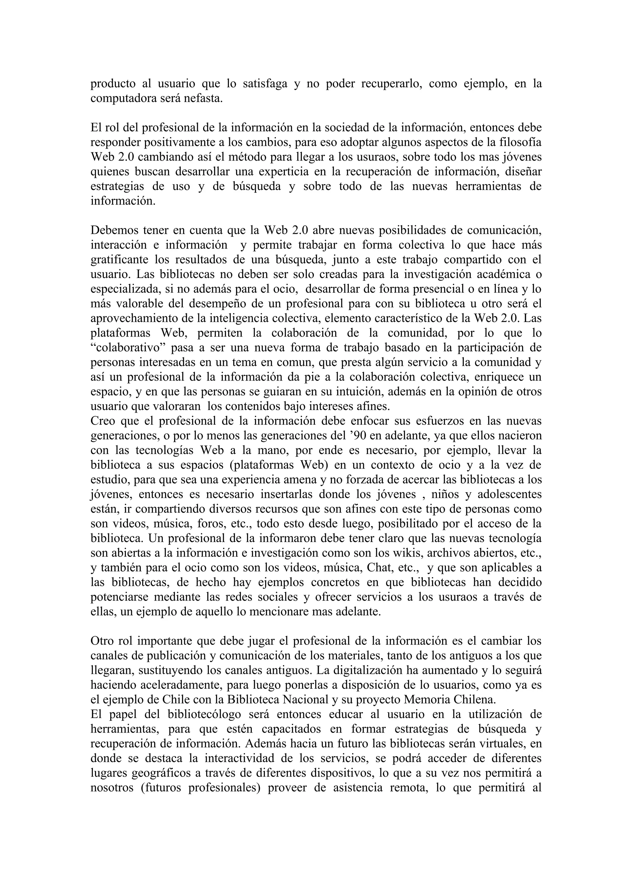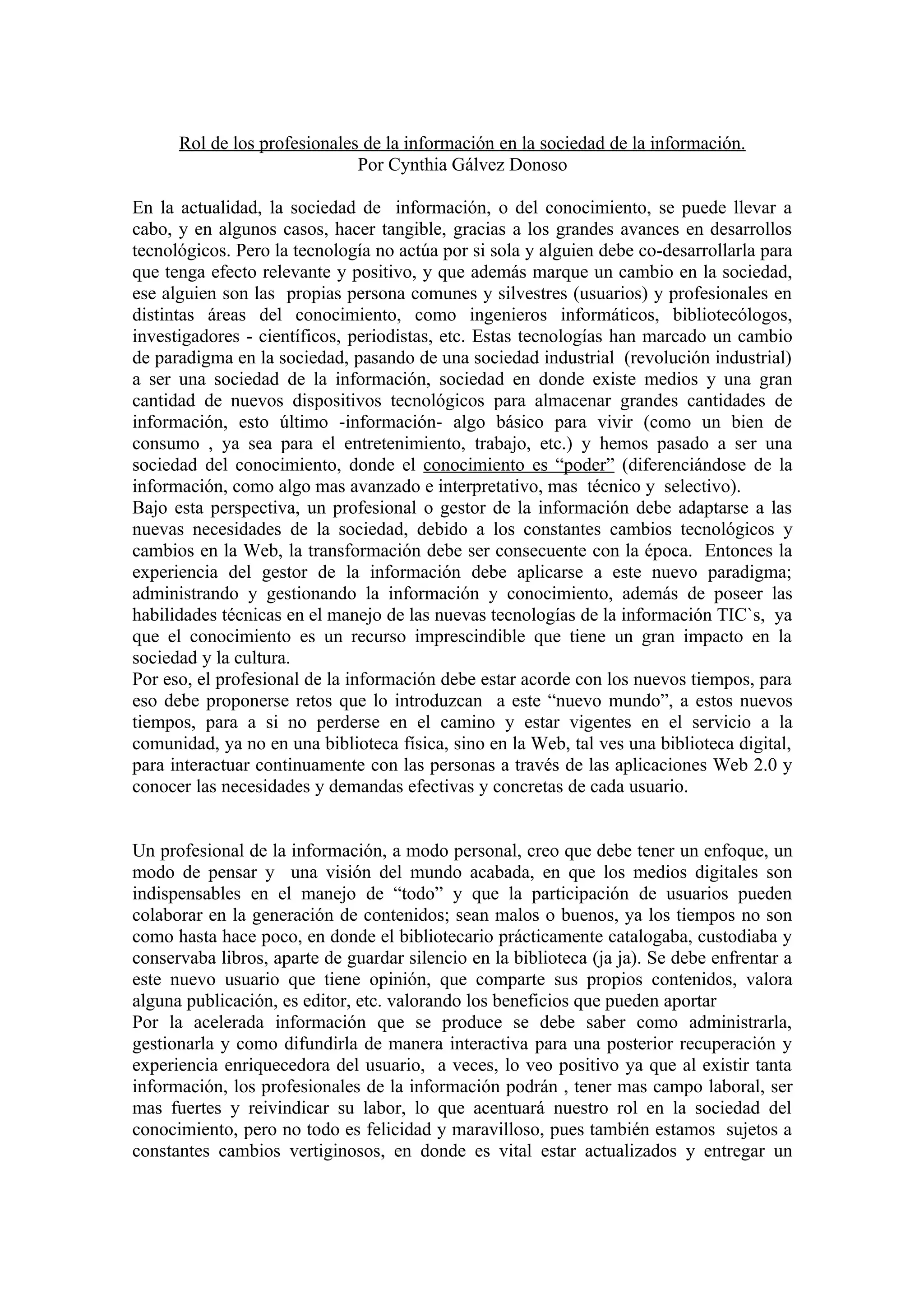 El documento describe el rol de los profesionales de la información en la sociedad de la información. Explica que deben adaptarse a los cambios tecnológicos y satisfacer las necesidades de los nuevos usuarios que usan las redes sociales. También destaca la importancia de que las bibliotecas usen plataformas como Facebook y Twitter para interactuar con los usuarios y ofrecer servicios de forma virtual.