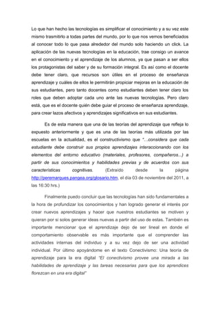 El documento discute cómo las tecnologías digitales han cambiado la manera en que aprendemos. Explica que el conocimiento ahora es más accesible a través de Internet y que las tecnologías permiten una interacción más activa entre estudiantes. También describe cómo el constructivismo refleja cómo los estudiantes construyen su propio aprendizaje a través de la interacción con su entorno educativo y experiencias previas. Finalmente, concluye que las tecnologías han profundizado el aprendizaje de los estudiantes y los motivan a gener