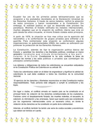 Ecuador adoptó inicialmente los Derechos Humanos en su constitución, pero durante un período de conflictos internos en las décadas de 1950 y 1970, el estado violó estos principios. ONGs se formaron para promover los Derechos Humanos. La constitución colombiana establece los deberes de los ciudadanos y las instituciones como la Defensoría del Pueblo y la Procuraduría General que protegen los Derechos Humanos.