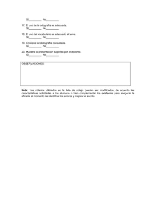 Este documento presenta una lista de cotejo para la autoevaluación de ensayos. Contiene 20 criterios para revisar si el ensayo cumple con los requisitos establecidos en clase. Entre los criterios se incluyen tener título, establecer claramente el tema, la tesis y los argumentos, incluir referencias que sustenten la argumentación, tener una conclusión que vincule los puntos principales, y seguir las normas de redacción, ortografía y presentación sugeridas. La lista busca ayudar a los estudiantes a