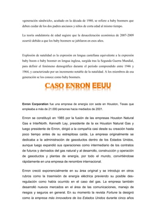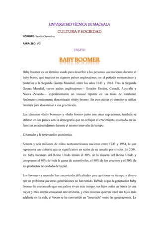 El documento proporciona información sobre el fenómeno demográfico conocido como "baby boom" que ocurrió después de la Segunda Guerra Mundial entre 1943 y 1964, resultando en un aumento significativo en las tasas de natalidad en países anglosajones. Explica que los 76 millones de bebés nacidos en este período en los EE. UU. han tenido un gran impacto económico y han enfrentado desafíos al cuidar a sus padres ancianos y criar a sus propios hijos al mismo tiempo. También br