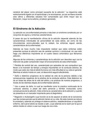 El documento proporciona información sobre el tema de la adicción. Explica que la adicción es una enfermedad física y emocional que crea dependencia hacia una sustancia o actividad debido a la satisfacción que causa. Describe los síntomas característicos de la adicción como la pérdida de control, el uso continuo a pesar del daño y la negación. También analiza factores específicos de adicciones como el alcoholismo, el tabaquismo y la anorexia.