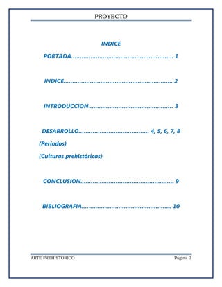 Este documento presenta un proyecto sobre el arte prehispánico en México. Se divide en secciones como introducción, desarrollo, y conclusión. En la introducción, explica que cubrirá las características de las culturas prehispánicas y su arte a través de los periodos. En el desarrollo, describe los periodos preclásico, clásico y posclásico, así como las culturas Olmeca, Maya y Teotihuacana. Finaliza con una breve conclusión.