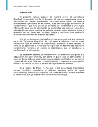 Este documento presenta un resumen de la teoría del aprendizaje significativo propuesta por David Ausubel, en donde destaca que este tipo de aprendizaje se logra cuando el estudiante puede relacionar los nuevos conocimientos con conceptos y ideas previamente adquiridos de manera significativa. Asimismo, señala algunos de los requisitos y ventajas de este tipo de aprendizaje, así como las aplicaciones pedagógicas que propone Ausubel.