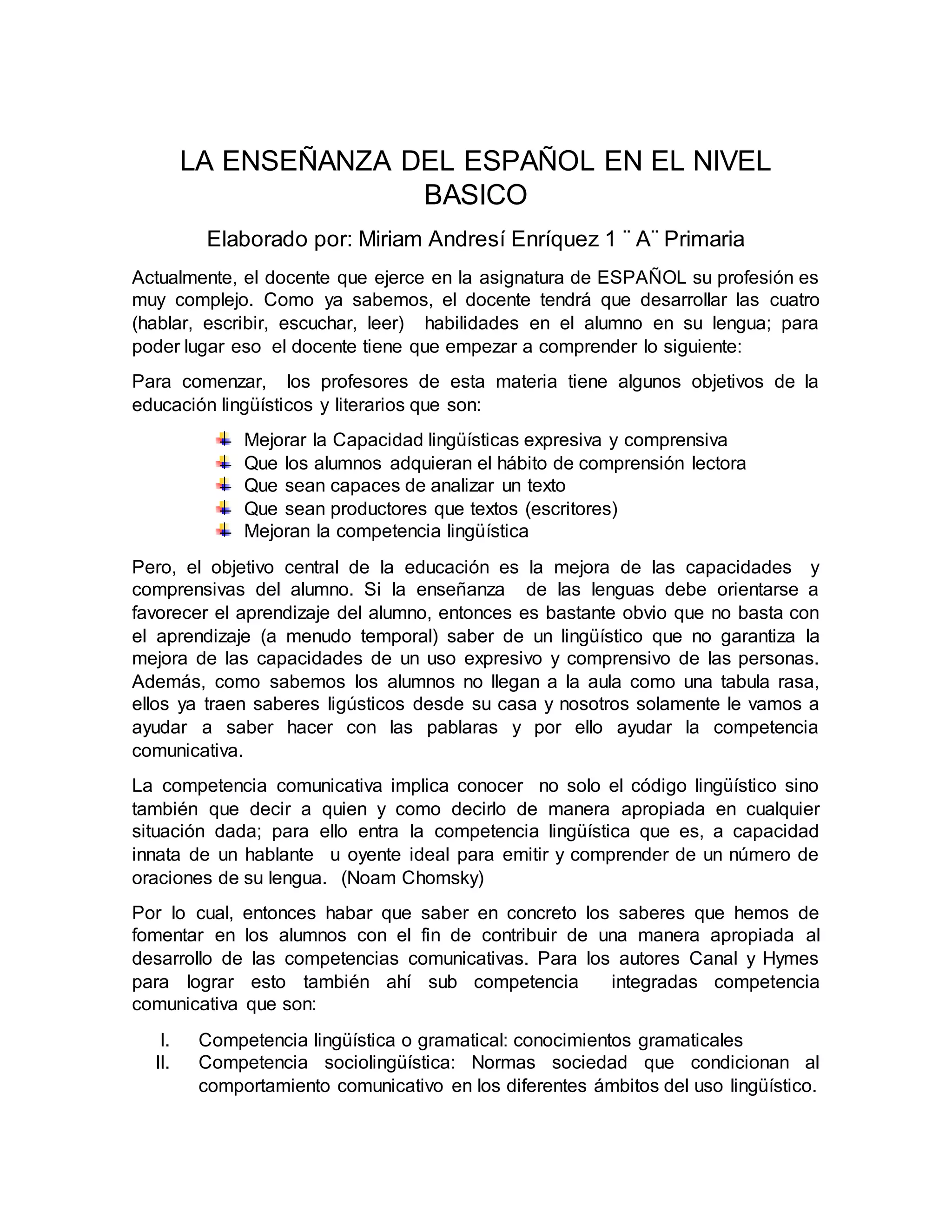 El documento discute los objetivos y desafíos de enseñar español a nivel básico. Los profesores deben desarrollar las cuatro habilidades lingüísticas en los estudiantes y mejorar sus capacidades expresivas y comprensivas. La enseñanza debe orientarse a favorecer el aprendizaje de los estudiantes mediante el uso de contenidos relevantes y proyectos que desarrollen la competencia comunicativa. La enseñanza de la lectura y escritura es particularmente desafiante y requiere hacer de la escuela una com