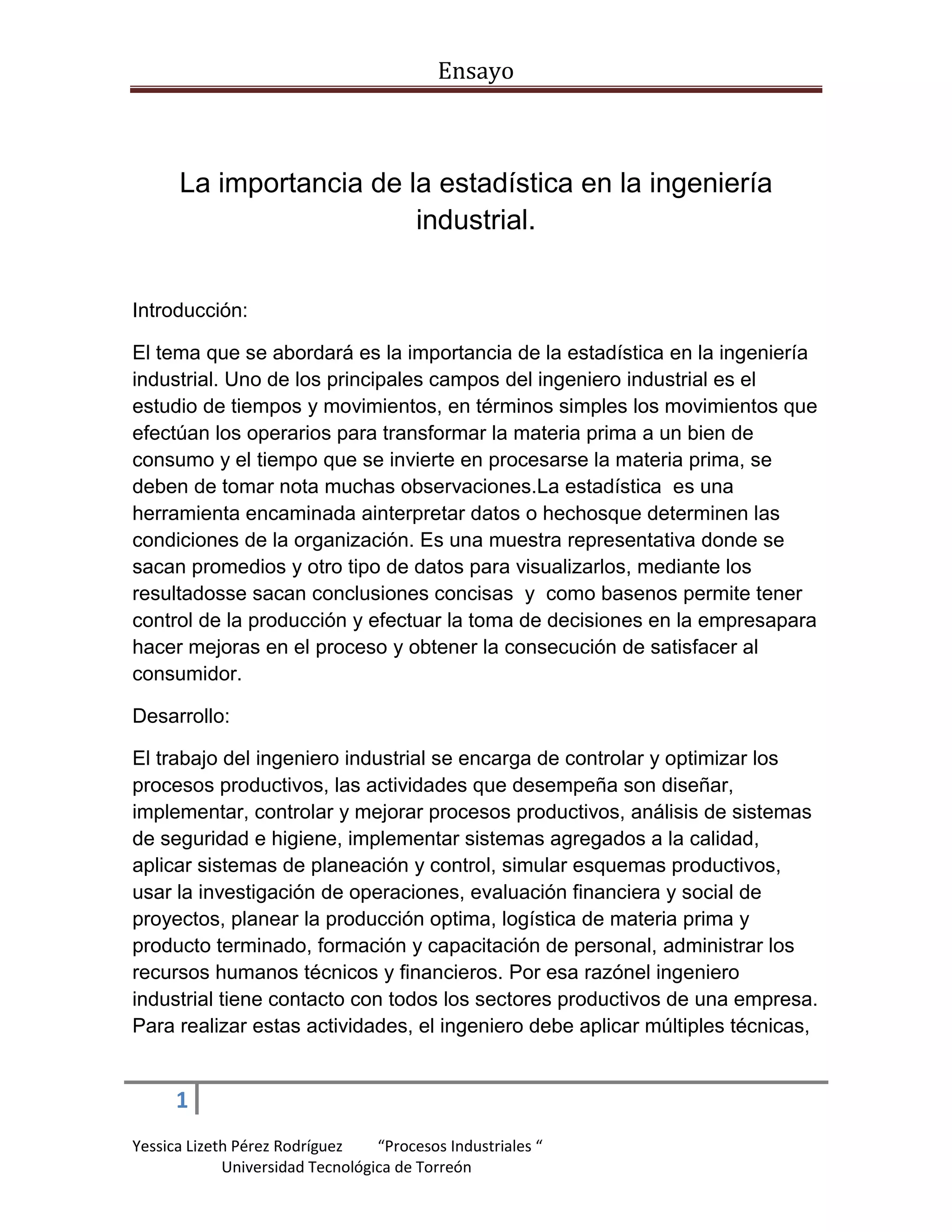 El documento describe la importancia de la estadística para los ingenieros industriales. Explica que los ingenieros industriales usan la estadística para controlar procesos productivos, tomar decisiones efectivas, determinar las necesidades de los consumidores, controlar la calidad y los recursos como la materia prima. También señala que sin el uso de la estadística, los ingenieros no podrían optimizar y controlar el proceso productivo de una organización.