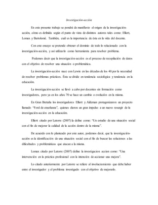 Este documento resume el tema de investigación-acción. Define la investigación-acción como el proceso de recopilar datos para resolver una situación problemática, con el objetivo de mejorar la calidad de la acción. Explica que la investigación-acción es importante para los docentes porque les ayuda a mejorar su práctica a través de la reflexión, comprender su trabajo y mejorar las situaciones en el aula. Finalmente, señala que la investigación-acción recopila información para solucionar problemas en el contexto educativo.
