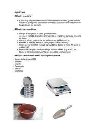 El documento presenta el informe de un análisis granulométrico mecánico realizado a una muestra de agregado fino. Se describen los objetivos, equipos, marco teórico y procedimiento del análisis. Los resultados muestran que la muestra tiene un alto contenido de finos y no cumple con los límites de un buen agregado fino según la norma ASTM. Se concluye que el método fue aplicado correctamente pero la muestra no es adecuada y se entregan recomendaciones para mejorar futuros análisis