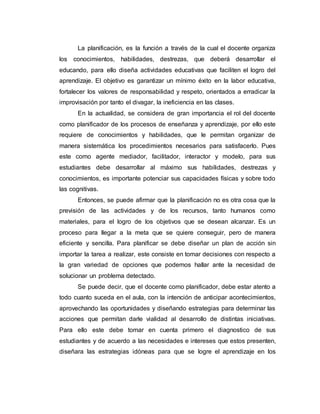 Este documento discute la importancia de la función de planificación del docente. Explica que la planificación es fundamental para organizar los conocimientos y habilidades que el estudiante debe desarrollar, y para diseñar actividades educativas que faciliten el aprendizaje. También destaca que la planificación requiere que el docente conozca y desarrolle sus propias habilidades para mediar entre los procesos de enseñanza y aprendizaje. Finalmente, resume que una buena planificación implica definir objetivos, caracterizar a los estud