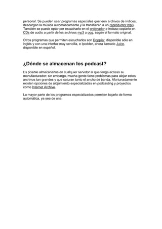 El podcast surge de la combinación de las palabras iPod y broadcast. Se originó en 2004 cuando Adam Curry agregó archivos de audio a feeds RSS para que la gente pudiera descargarlos a sus iPods. Los podcasts contienen diversos tipos de contenido como personas hablando sobre diferentes temas, programas de radio con música e interludes, o podcasts cortos exclusivamente de voz. La gente puede escuchar podcasts descargándolos de sitios web o usando aplicaciones que descargan y transfieren archivos automáticamente a sus reproductores mp3.