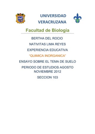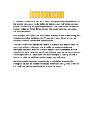 Este documento trata sobre un ensayo sobre el tema del suelo. Explica que el suelo es esencial para la vida en la tierra y proporciona nutrientes y hábitat para plantas e insectos. Describe las propiedades físicas y químicas del suelo, incluida su textura, estructura, consistencia, temperatura y color. También aborda la importancia biológica del suelo y los factores que afectan al suelo como la basura, fertilizantes químicos, aguas negras y la urbaniz