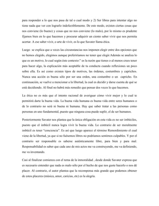 El documento resume un ensayo de Fernando Savater titulado "Ética para Amador" que explora conceptos como la libertad, la conciencia y la responsabilidad. Explica que la ética se ocupa de cómo usamos nuestra libertad y que a veces no somos conscientes de ella. También destaca la importancia de ponerse en el lugar de los demás y tratarlos como personas iguales a uno mismo. Finalmente, enfatiza la necesidad de aplicar estos principios éticos no solo en la vida personal sino también en el ámbito laboral, especialmente profes