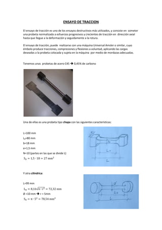 El ensayo de tracción somete probetas normalizadas de acero C45 a esfuerzos crecientes hasta la rotura para medir sus propiedades mecánicas. Se realizó el ensayo en una máquina universal con probetas cilíndrica y de chapa. Los cálculos mostraron que la probeta cilíndrica tuvo una resistencia a la tracción de 4500 Kp y un módulo elástico de 200000 Kp/mm2, mientras que la probeta de chapa tuvo una resistencia de 1100 Kp y un mó