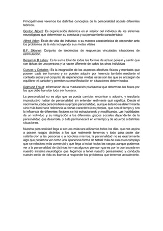 El documento presenta diferentes teorías y conceptos sobre la personalidad según varios teóricos. Explica que la personalidad está influenciada por factores biológicos, psicológicos y sociales, y se compone del temperamento (influencia biológica) y el carácter (influencia de experiencias). También resume las principales teorías psicodinámicas, humanistas, cognitivo-sociales y conductistas sobre la personalidad.